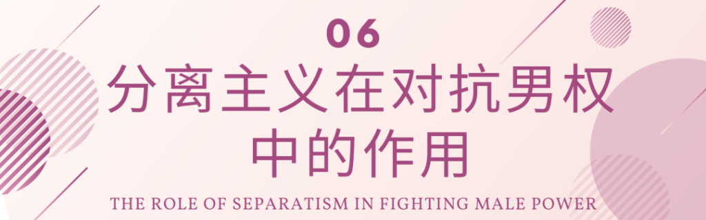 和凌驾于女性之上的男权作斗争需要策略。「通过分离实现平等(Separate to Integrate)」是个有效策略,即我们需要独立的全女性妇女解放组织为女性铺设权力基础。我们的首要要求是结束基于生理性别的人为劳动和权力分工,实现社会的男女平等,在这个社会中我们的差异得到重视,而不是被用来构建等级制度。争取女性解放的斗争需要全女团体,因为男女间存在诸多利益冲突,但女性解放的目标是不再以生理性别来定义个体。我是一名科学家,教师和政治活动家,同时也是一位母亲。我的生理性别只是描述我的几个身份标签之一。在有男人参与的情况下,我们根本无法组织起来反抗男权,好比白人在场时有色人种无法组织起来反对白人权力;老板在场时我们无法组织起来反对作为工人遭受的不公正待遇。引用十九世纪美国著名黑人政治家弗雷德里克·道格拉斯的名言:「没有要求,权力不会让步。过去没有,将来也不会有」。女性,有色人种,工人阶级需要和那些遇到相似问题的人结盟共同提出平等权力的诉求。