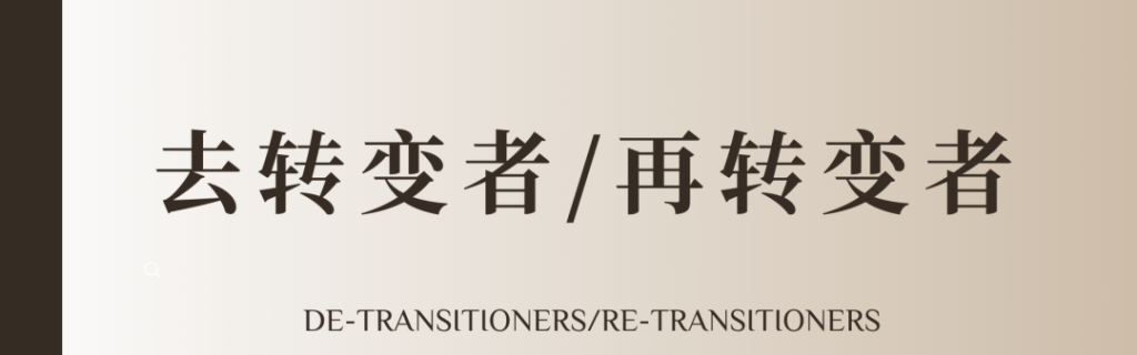 在西方青少年进行医学转变的故事中,我们也看到越来越多自称「去转变者(de-transitioners)」或「再转变者(re-transitioners)」的个体。他们多年来持续使用异性荷尔蒙,许多人的声线已永久改变,原本健康的身体部位被切除,但他们逐渐意识到错误:跨性别无法解开内心深处的创伤更无法帮助直面社会性别化世界的残酷。因此他们开始停止药物治疗,承认心理因素对进行医学转变的决定的影响,并面对由此带来的严峻现实和复杂挑战。