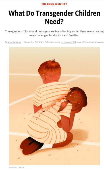 2015年,有关跨性别儿童的文章在互联网迅速成为热门话题,像花粉一样在数字世界散布开来。杂志文章也遵循类似轨迹,例如『一位母亲介绍跨性别女儿的一封信』,『妈妈,我不是那种女孩』,和『母亲教训那些不理解跨性别女儿的反对者』等作品都偏爱一类叙事,即孩子们乐于接受文化规范下的男性或女性特质,甚至与其生物性别相反的社会性别刻板印象。尽管粉红独角兽和留长发本身并不具备女性特质,几乎每篇文章都试图说服我们一个喜欢玩粉红独角兽和留长发的男孩是个困在错误身体里的女孩,却对许多北美和南美土著部落以及旁遮普锡克文化的男孩,甚至成年男性,都留长发的事实视而不见。