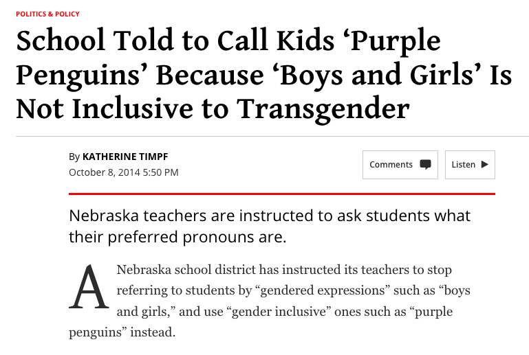 位于美国中西部的内布拉斯加州的一个学区已明确指示教师不得称学生男孩和女孩,而要使用「社会性别包容(gender inclusive)」的表达方式,例如称学生们为「紫色企鹅」。