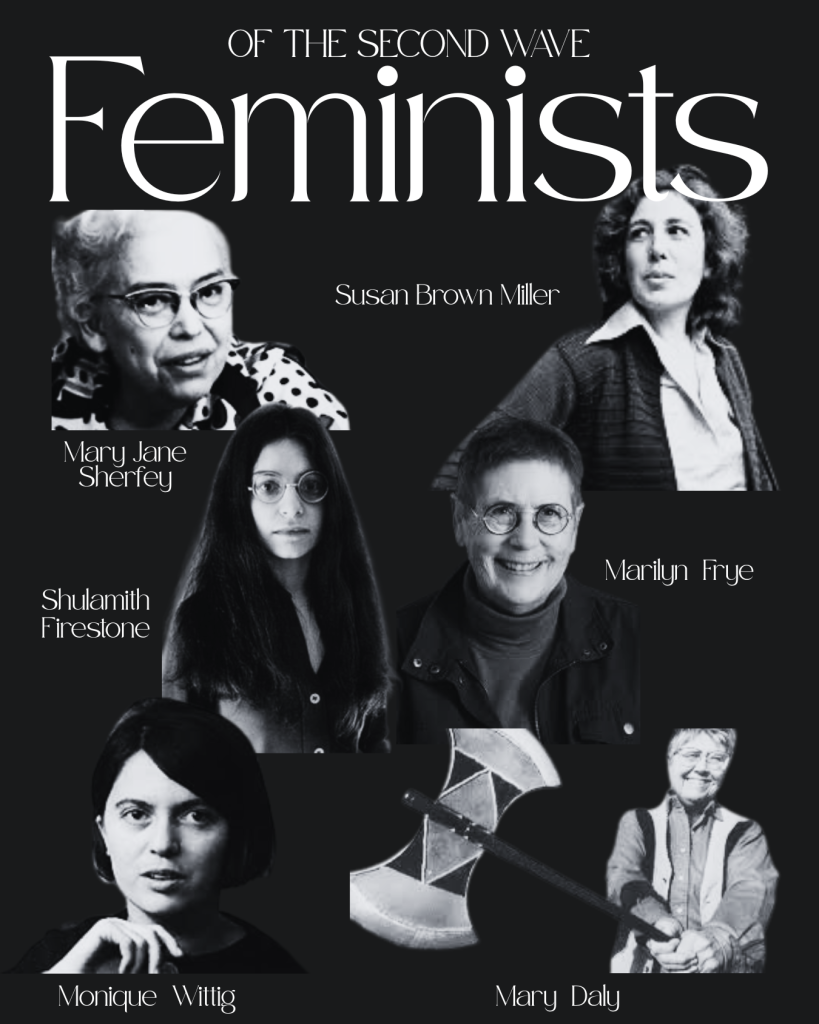 - 作者注:该组织也被称为「女权主义者:消灭社会性别角色的政治组织」。她们于1968年从美国全国妇女组织分裂出来,并于1968-1973年间活跃于纽约。其最著名的核心成员是蒂-格蕾丝·阿特金森,其成员还有安妮·科德特(直到 1969 年再次分裂)、希拉·迈克尔斯、芭芭拉·梅尔霍夫、帕梅拉·基伦及希拉·克罗南。该团体认为,女性因内化压迫性的生理性别角色而受到虚假意识的影响。作为分离主义者,她们致力于发展女性文化。 ↩︎