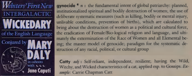 4.语言变革。还有另一群激进女权主义者聚焦于我们今天可能称之为「语言抗争运动(linguistic activism)」,这是一种专注于词汇、概念与含义重构的行动。玛丽·戴利和简·卡普蒂合著了《韦氏第一版新星际恶女英语(Webster’s First New Intergalactic Wickedary of the English Language)》5。这本词典充满了新词以及对旧词的新释。谩骂之词被夺回并赋予新的含义,例如「catty(刻薄/猫一样的)」变为「自立、独立、坚韧;兼具猫的野性、巫魅与反叛特质」。新概念帮助女性直面其历史并将自身视为一个种姓,例如,「女性灭绝(gynocide)」一词被发明出来意指「有计划、制度化的、对女性精神和肉体的摧毁;蓄意采取系统性手段(如杀戮、身体或精神伤害、不适于生存的环境、阻止出生),旨在摧毁作为政治文化力量存在的女性,根除女性/生命-逻辑(Bio-logical)6的宗教和语言」。可以预见,数千年的男性支配已在语言中根深蒂固;这是女性直接尝试改写一些更为明显的父权词汇和概念,并对语言做出女权主义贡献的尝试。