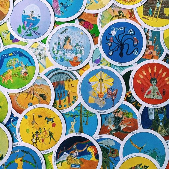 - 译者注:在第二轮浪潮期间,塔罗牌成为女权主义者们赋权、自我探索及挑战父权规范的工具,尤其通过卡伦·沃格尔与薇琪·诺布尔创作的标志性《母亲和平塔罗牌(Motherpeace Tarot)》(1978),该作品以女性神话形象重塑传统原型,并强调直觉胜于僵化教条。这场复兴运动与女性灵性紧密相连,通过聚焦内在智慧、女神崇拜及重塑女性精神实践,为制度化宗教提供了替代路径。 ↩︎